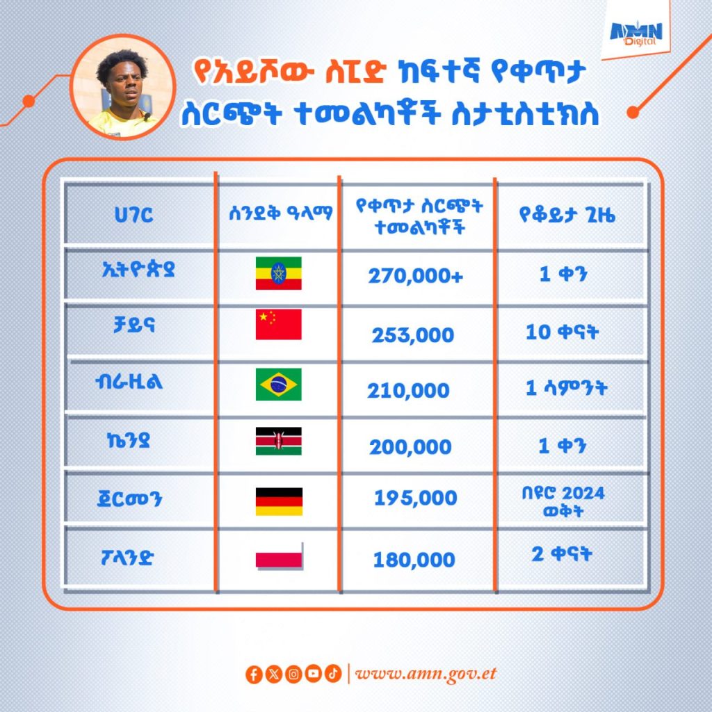 • የዕይታ ብዛት (Total Views)፦ የኢትዮጵያው ስርጭት በተለቀቀ በ24 ሰዓት ውስጥ ብቻ ከ 10 ሚሊዮን በላይ ዕይታዎችን አግኝቷል። ይህም ስፒድ ቀደም ሲል በብራዚል፣ በሕንድ እና በምዕራብ አውሮፓ ሀገራት ካደረጋቸው ስርጭቶች በበለጠ ፍጥነት “Trending” በመሆን ቀዳሚ ሆኗል።