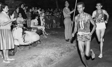 አበበ ቢቂላ ወደ ሮም ኦሎምፒክ ሲያቀና፣ አዳዲስ የሩጫ ጫማዎች እግሩን ስላቆሰሉት አንድ ከባድ ውሳኔ ወሰነ፤ በባዶ እግር መሮጥ፡፡ አስፋልቱ ይሞቃል፤ ድንጋዮቹ ይወጋሉ፤ ርቀቱ 42 ኪሎ ሜትር ነው። የሮምን አውራ ጎዳናዎች በባዶ እግሩ እየቀደደ፣ የፋሽስት ሞሶሊኒ ጦር ኢትዮጵያን ለመውረር የተነሳበትን የአክሱም ሐውልት አጠገብ አልፎ በመጀመሪያነት ሲገባ ዓለምን ያስገረመ ታሪክ ተሠራ።