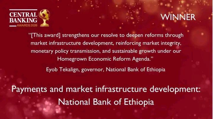 የኢትዮጵያ ብሔራዊ ባንክ በፋይናንስ መሰረተ ልማት ላደረጋቸው ሪፎርሞች ዓለም አቀፍ ሽልማት አግኝቷል።