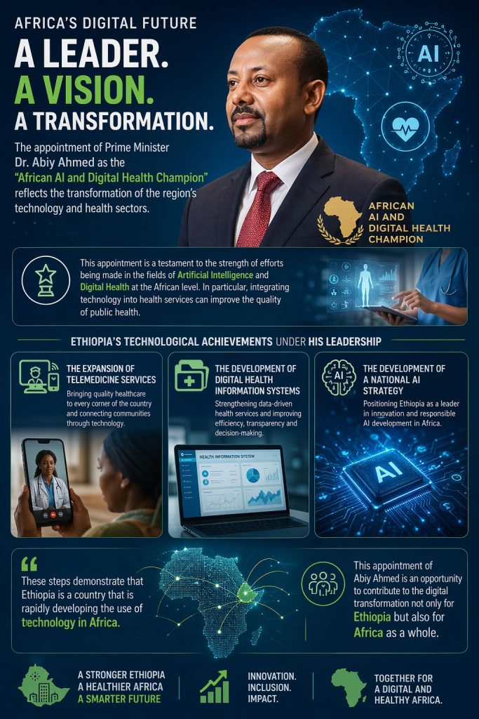 ‎በቅርቡ የአፍሪካ ኅብረት ጠቅላይ ሚኒስትሩን የሰው ሠራሽ አስተውሎት (AI) እና የዲጂታል ጤና ሻምፒዮን አድርጎ መሾሙ፣ ቀደም ሲል የተቀበሏቸው የአለም የምግብና እርሻ ድርጅት (FAO) ሽልማት፣ የአግሪኮላ ሜዳሊያ፣ የላቀ የአፍሪካ መሪነት ሽልማት እና የኢጋድ (IGAD) የቱሪዝም ሻምፒዮንነት እውቅናዎች ላይ የተጨመረ ማረጋገጫ ነው።